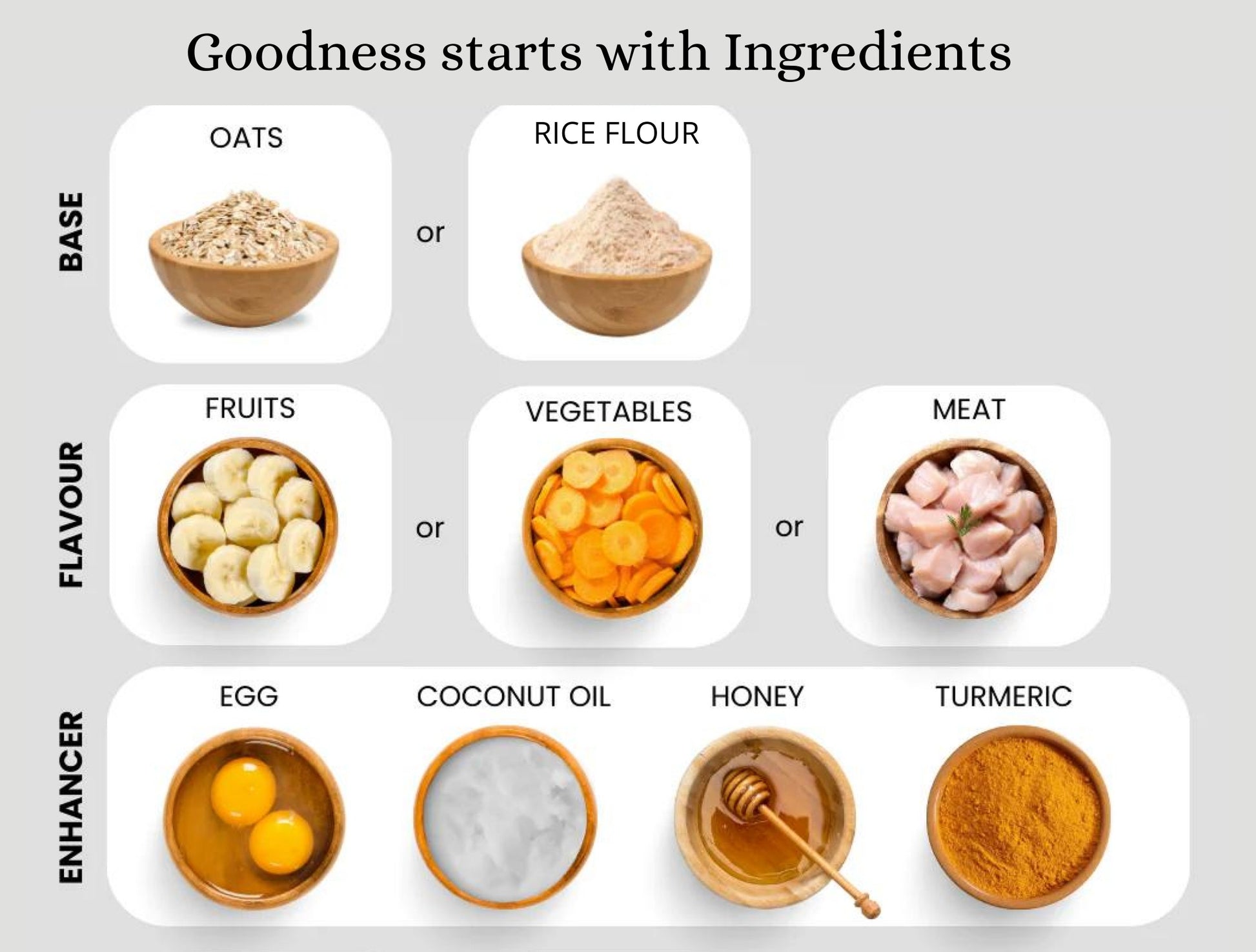 Freshly prepared using pet friendly ingredients only. Oats base with fresh toppings and unsalted cheddar cheese.